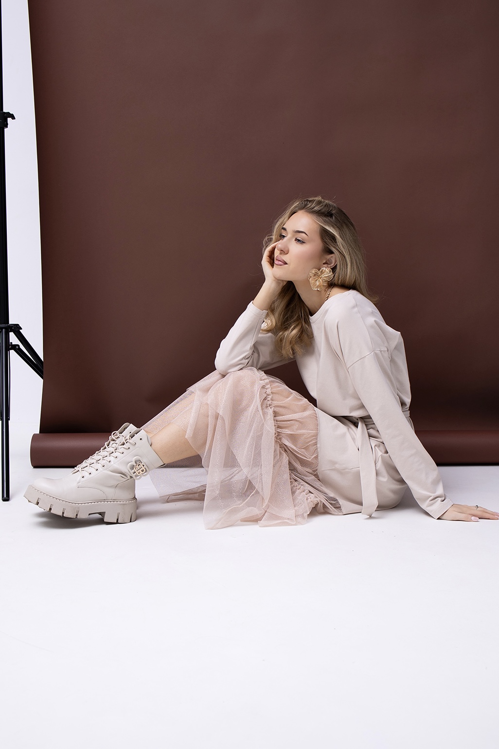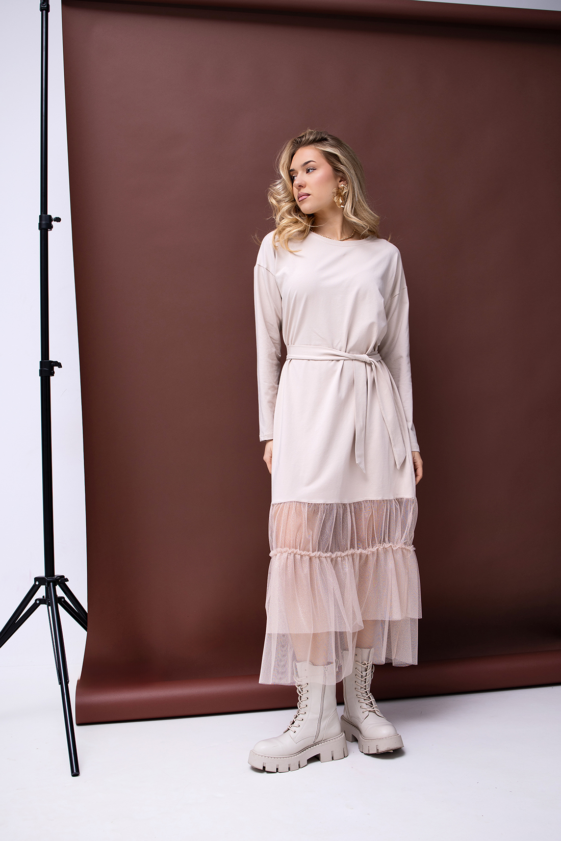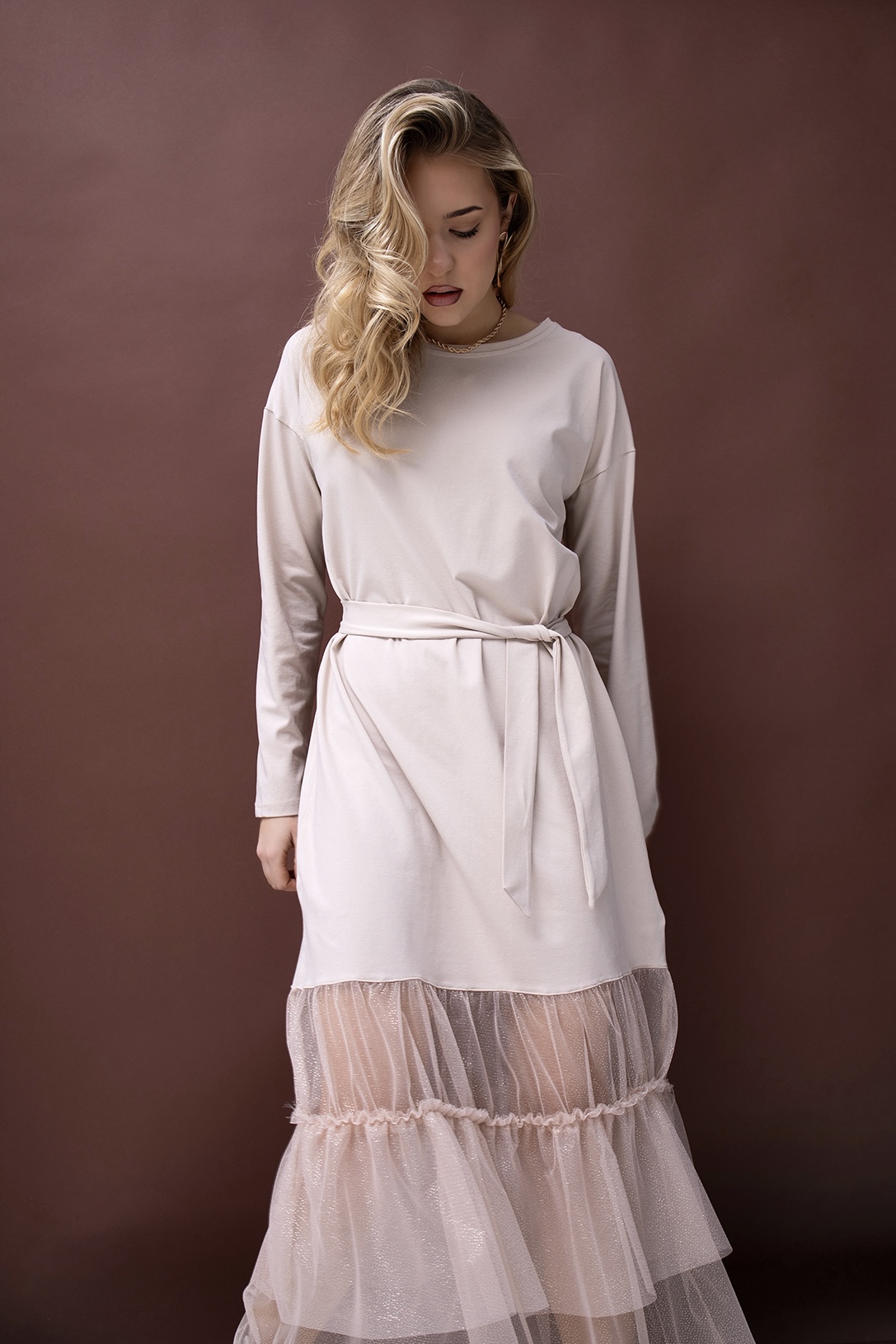 Długa, kobieca forma stworzona z połączenia klasycznej sukienki (do kolan) przedłużonej efektowną, tiulową falbaną, która robi całą stylówkę od razu 🔥